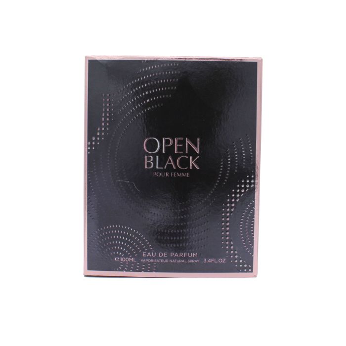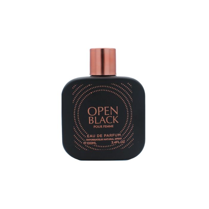 Découvrez Open Black Pour Femme 100 ml de Sterling Perfumes, avec des notes de tête de poivre rose, de cassis, de fleur d’oranger, de poire, avec des notes de cœur d’iris, de café, de jasmin, d’amande et des notes de fond de patchouli, de vanille, de bois de cèdre, de fève tonka.