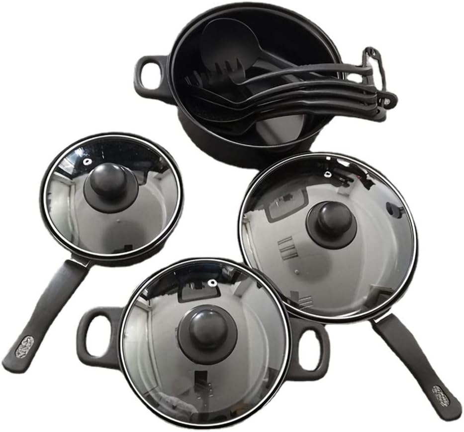 - Tous les éléments essentiels : le kit de cuisine comprend une poêle à frire de 22 cm, une marmite de 22 cm avec couvercle, une marmite de 18 cm avec couvercle, une marmite à lait de 16 cm avec couvercle et un ensemble de cuillères de cuisine.