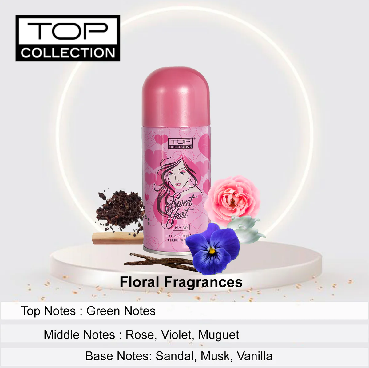 Embrassez l’enchantement du spray parfum déodorant EDT Top Collection – Sweet Heart, 200 ml. Ses notes de tête de notes vertes se mélangent gracieusement aux notes de cœur de fleurs, de rose, de muguet et de violette, le tout caressé par des notes de fond de santal, de muscs et de notes poudrées de vanille. Laissez le parfum de l’amour captiver vos sens.